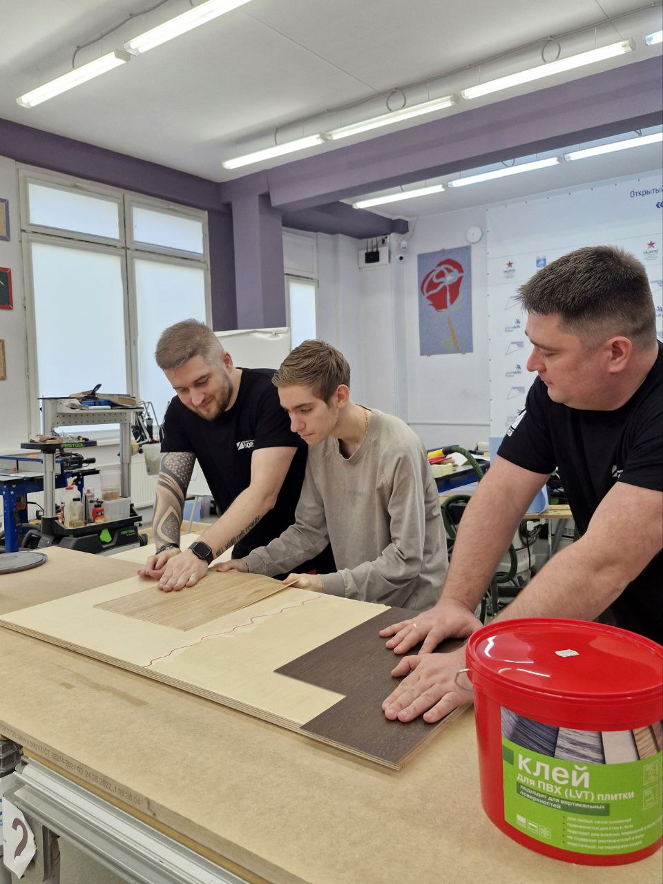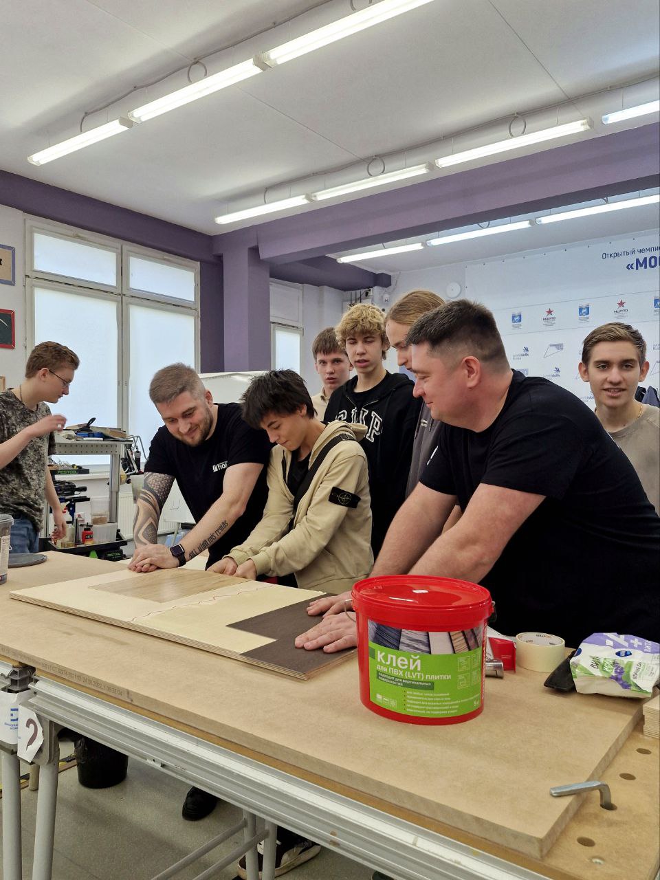 Специалисты познакомили ребят с современными материалами, инструментами, оборудованием и технологиями для укладки напольных покрытий. Особый интерес у участников вызвала демонстрация клея для влажных помещений, который можно наносить на горизонтальные и вертикальные поверхности. Технология позволяет выполнить ремонт в ванной комнате всего за 24 часа без снятия старой плитки.